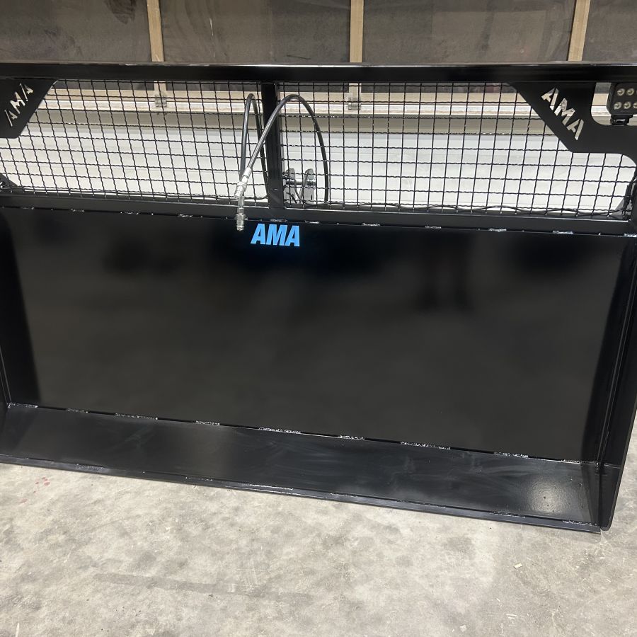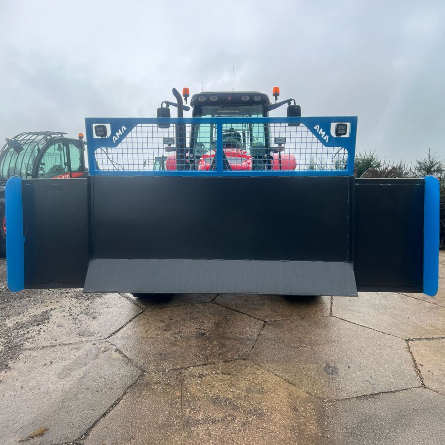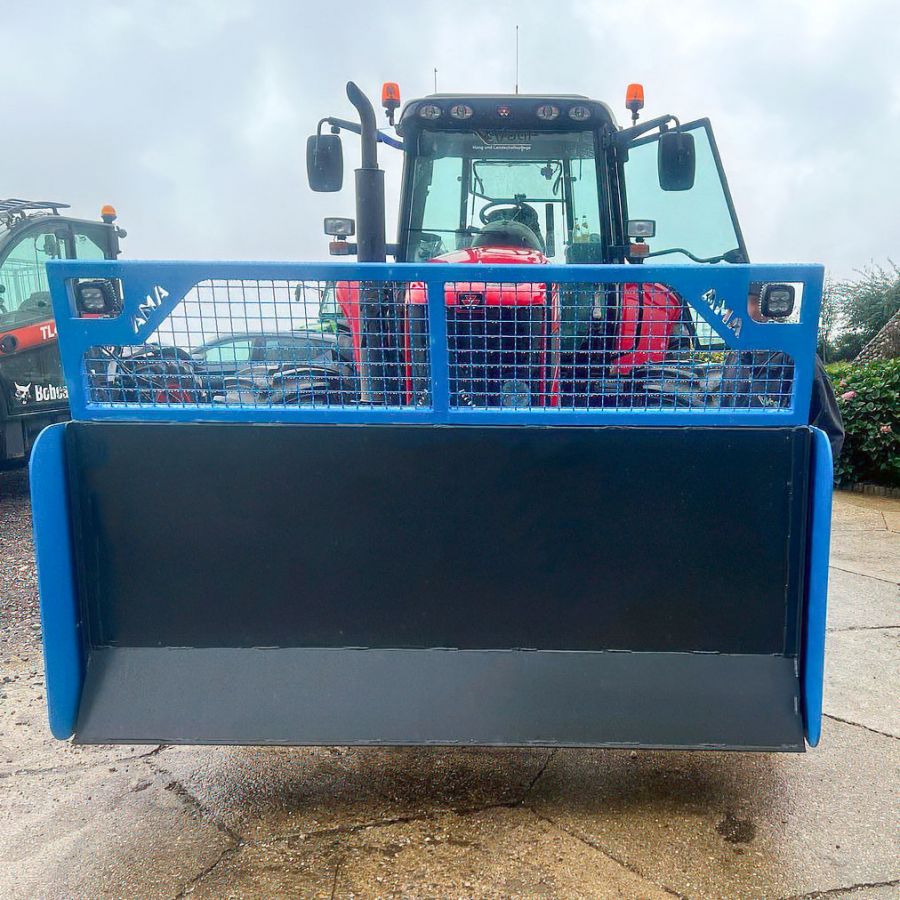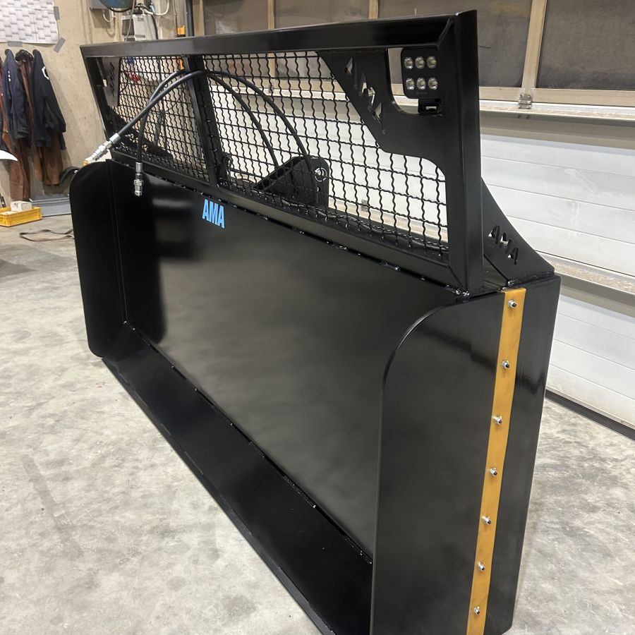 Das AMA-Maisschiebeschild ist nah am Schlepper montiert, was die Manövrierbarkeit erheblich erleichtert und eine präzise Steuerung ermöglicht. Zusätzlich sorgt ein robuster Gitteraufsatz für eine hervorragende Rundumsicht, sodass der Fahrer stets den Überblick über das Arbeitsfeld behält. Ein entscheidender Vorteil, insbesondere bei beengten Platzverhältnissen im Silo. Die Schürfleiste aus hochwertigem Hardox-Stahl garantiert eine lange Lebensdauer und exzellente Schiebeeigenschaften. Für den Einsatz bei schlechten Lichtverhältnissen kann das Maisschiebeschild von AMA optional mit leistungsstarken Arbeitsscheinwerfern ausgestattet werden. Damit ist auch bei Dunkelheit ein effizientes und sicheres Arbeiten gewährleistet.