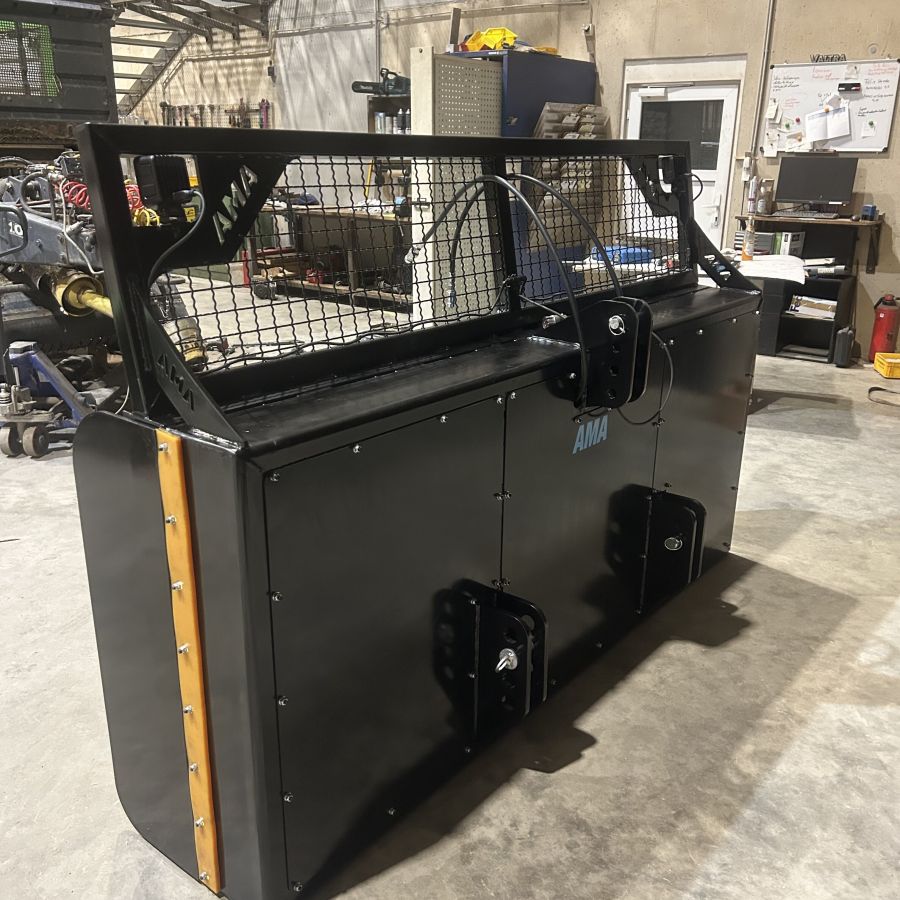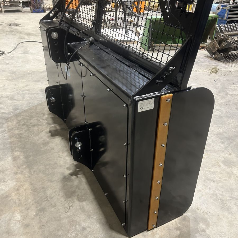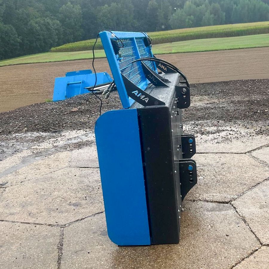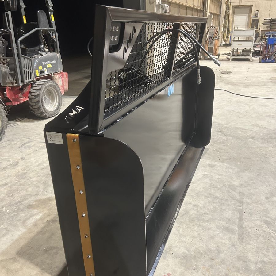 Das AMA-Maisschiebeschild ist nah am Schlepper montiert, was die Manövrierbarkeit erheblich erleichtert und eine präzise Steuerung ermöglicht. Zusätzlich sorgt ein robuster Gitteraufsatz für eine hervorragende Rundumsicht, sodass der Fahrer stets den Überblick über das Arbeitsfeld behält. Ein entscheidender Vorteil, insbesondere bei beengten Platzverhältnissen im Silo. Die Schürfleiste aus hochwertigem Hardox-Stahl garantiert eine lange Lebensdauer und exzellente Schiebeeigenschaften. Für den Einsatz bei schlechten Lichtverhältnissen kann das Maisschiebeschild von AMA optional mit leistungsstarken Arbeitsscheinwerfern ausgestattet werden. Damit ist auch bei Dunkelheit ein effizientes und sicheres Arbeiten gewährleistet.