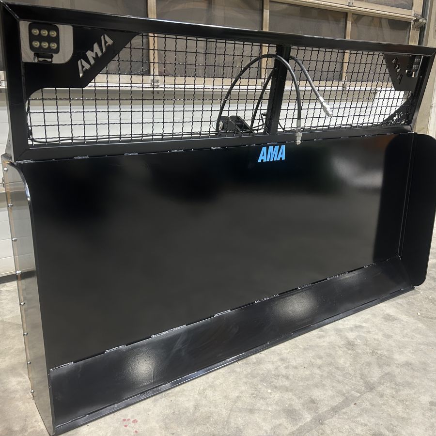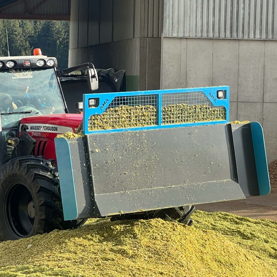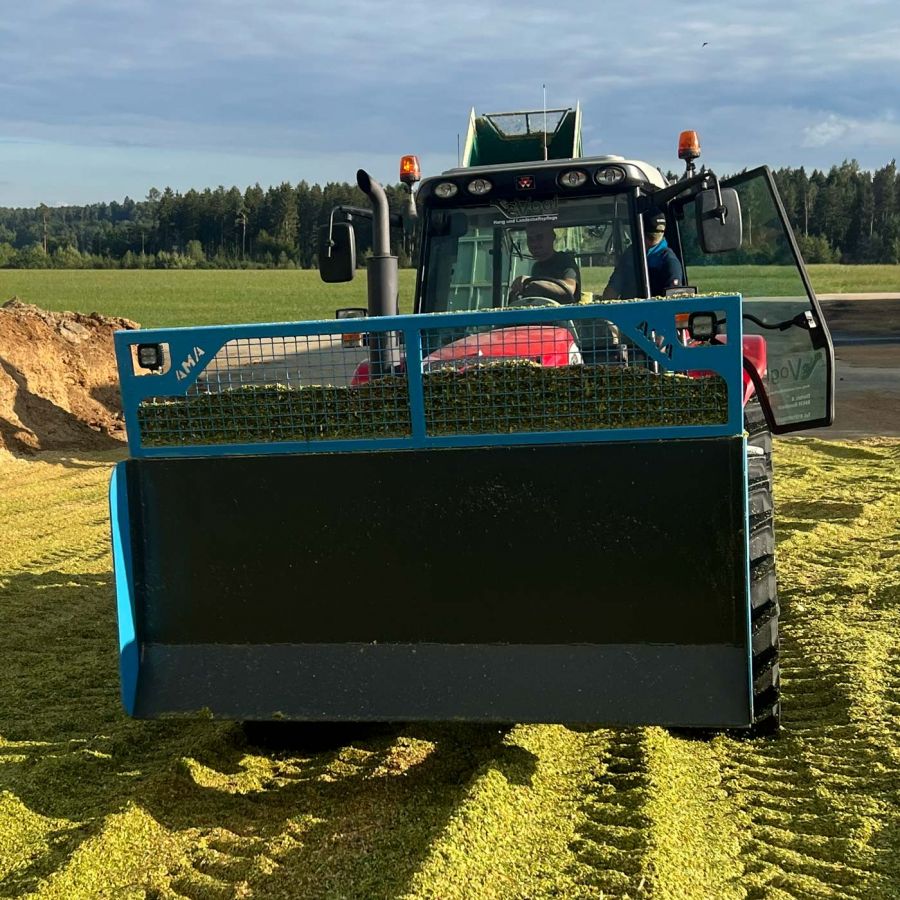 Die von AMA entwickelten und hergestellten Maisschiebeschilder reduzieren erheblich den Arbeitsaufwand beim Silieren von Maissilage und Grassilage. Vor allem bei der Variante mit hydraulisch verstellbarer Breite.