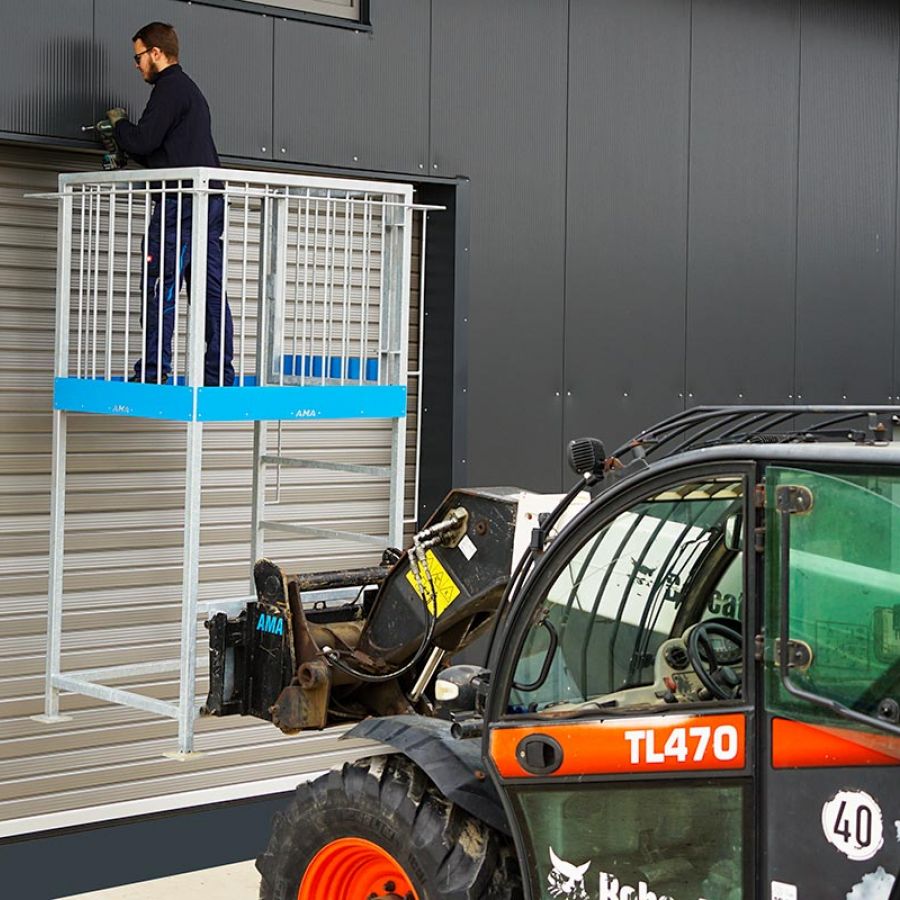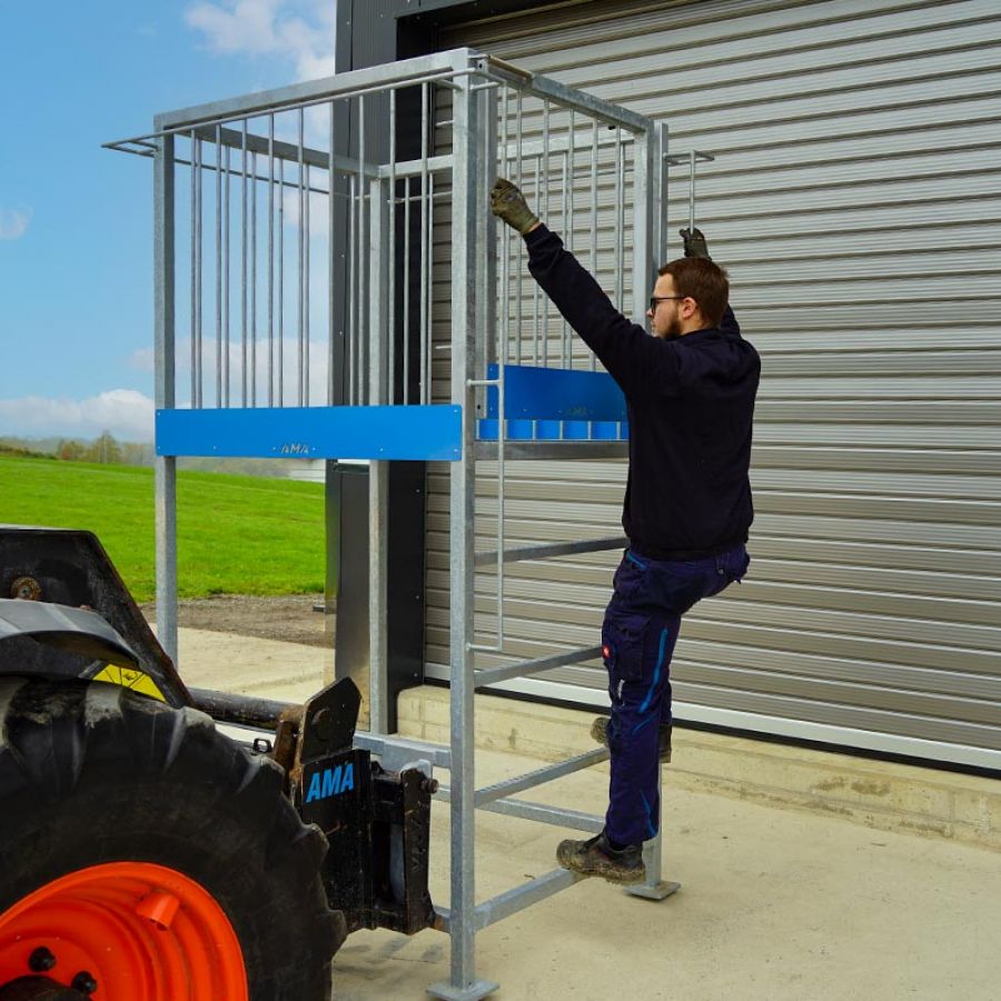 Der AMA-Arbeitskorb mit Erhöhung ist für alle gängigen Aufnahmen konzipiert, sodass er mit verschiedenen Trägerfahrzeugen wie Traktoren, Staplern oder Baumaschinen wie Lader verwendet werden kann. Je nach Ausführung des Arbeitskorbs kann eine zweite zusätzliche Aufnahme für Staplergabel oder Dreipunktaufnahme Kat. 2 gewählt werden. Für zusätzliche Sicherheit ist ein optionales Staplerschutzgitter erhältlich. Der Arbeitskorb mit Erhöhung von AMA ist im Standard 1050 mm breit und in Längen zwischen 1300 mm bis 2000 mm erhältlich und wird so unterschiedlichsten Anforderungen gerecht. Eine seitliche Tür ermöglicht einen bequemen und sicheren Einstieg, was die Arbeit besonders komfortabel macht.